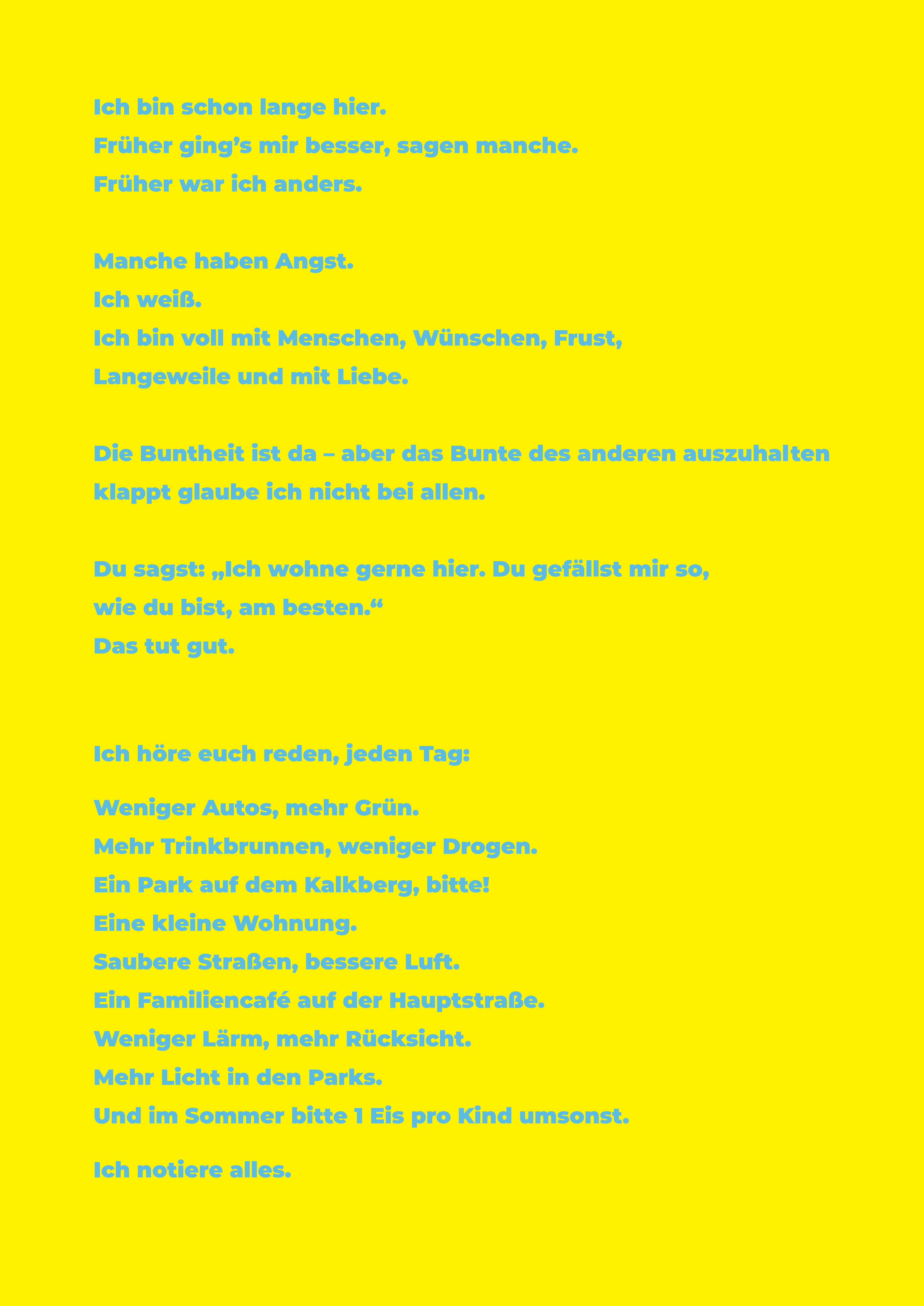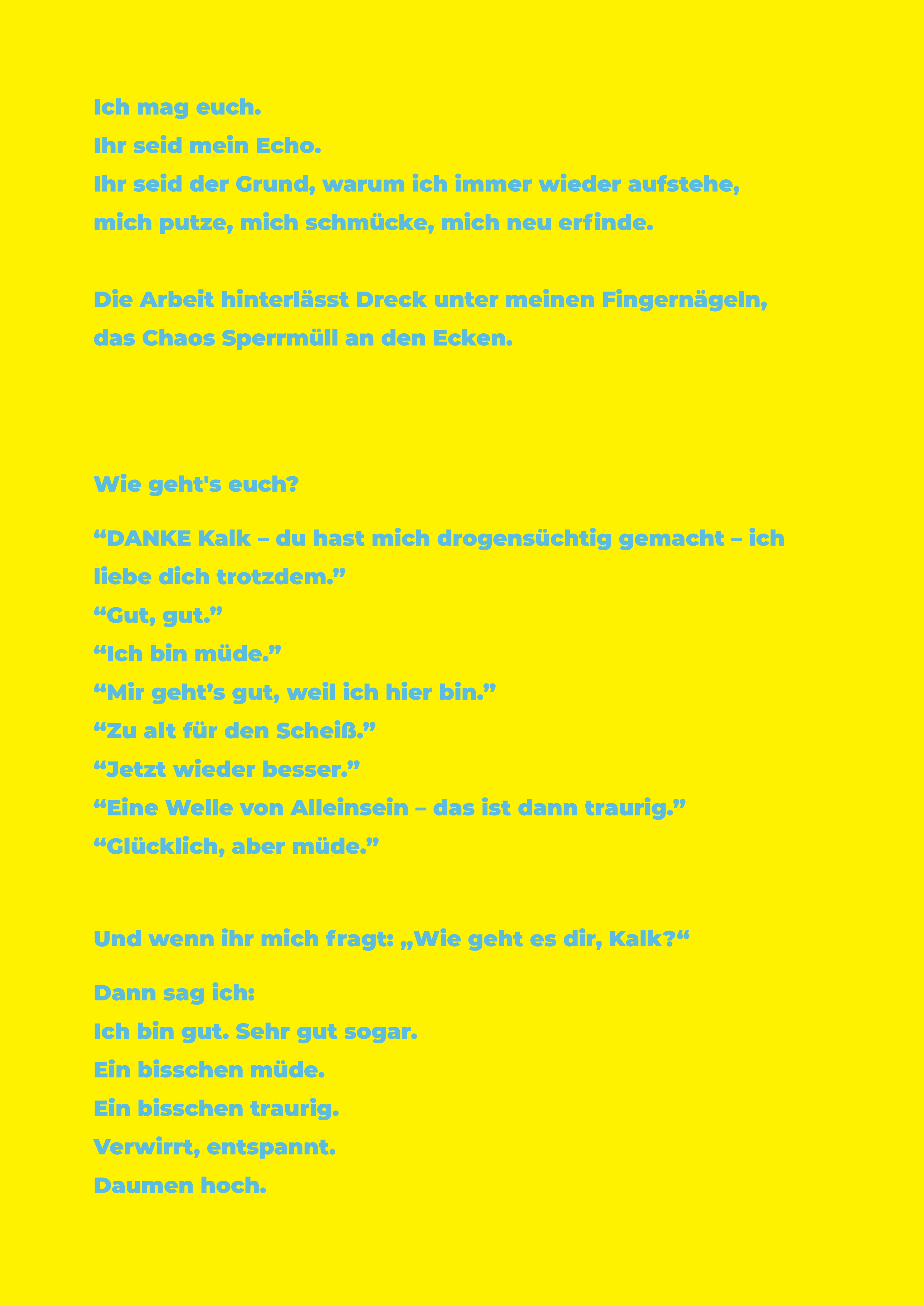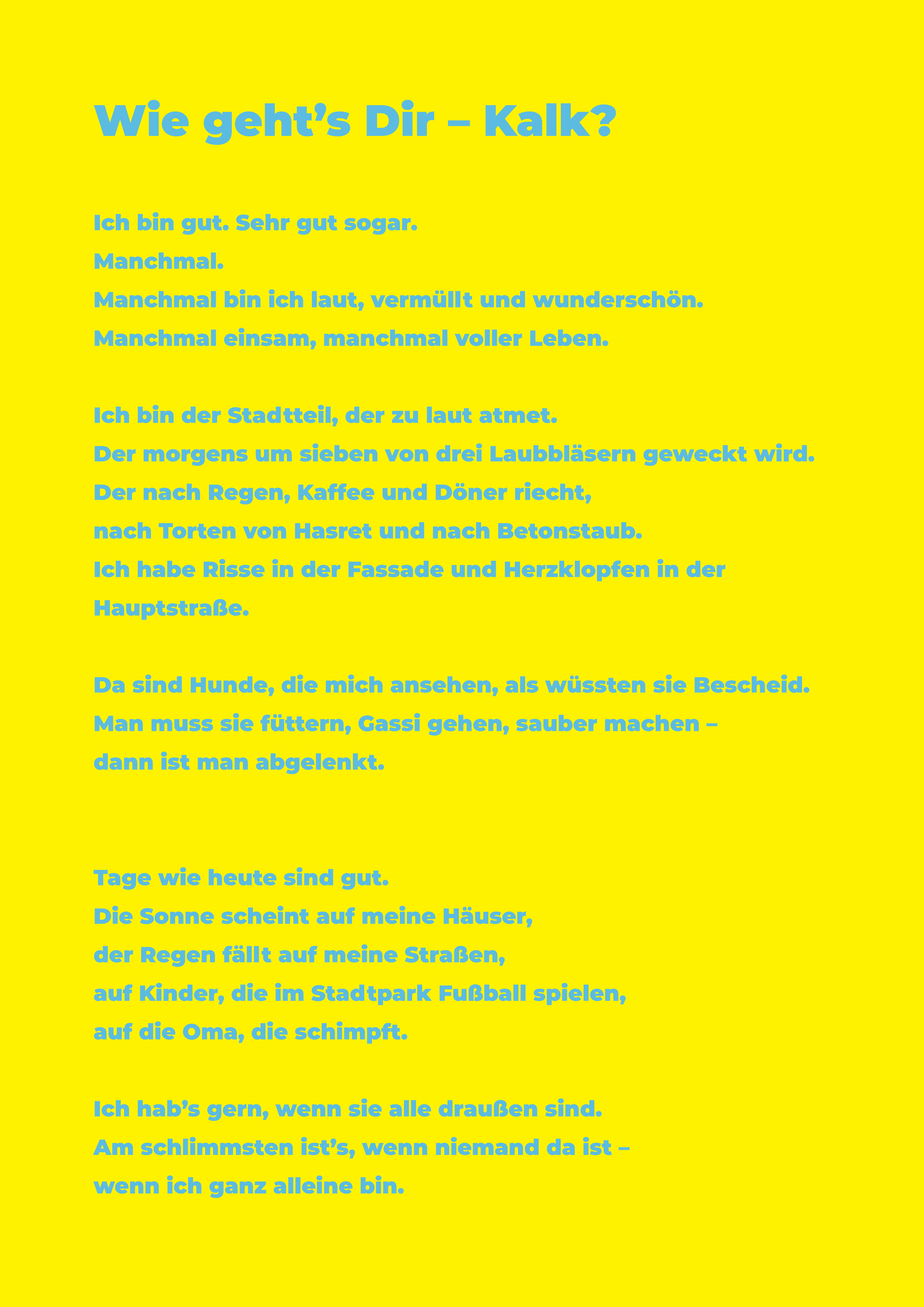Im Zeitraum Juli bis Oktber 2025 haben TUN&LASSEN mit dem Projekt “Wie geht’s dir – Kalk?” mit vielen Menschen gesprochen: Mit Kalker:innen, ehemaligen Kalker:innen und Menschen, die Kalk besuchen. Diese Gespräche, Gedanken und Wünsche haben sie dokumentiert und sortiert. Mit Hilfe von Künstlicher Intelligenz haben sie alles zusammenfließen lassen zu einem Monolog – den Kalk selber spricht. Sie haben sich gefragt: Welche Perspektiven entstehen dabei? Wie reagieren wir beim Lesen? Welche Übereinstimmungen entstehen und wie halten wir Widersprüche aus?